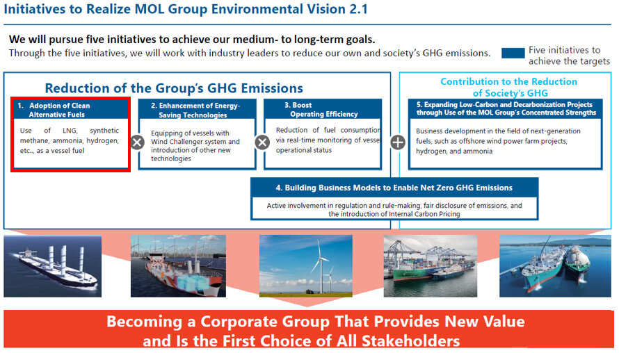 The MOL Group set the target, "With the concerted effort throughout the Group, achieve net zero GHG emissions by 2050" in "MOL Group Environmental Vision 2.1" (Note 5). It is promoting the wider adoption of LNG fuel through development and advancement of an LNG fuel supply system in Japan and overseas. It also plans to launch about 90 LNG-fueled vessels by 2030 as an initiative to introduce clean alternative fuels (Fig.1). The group will develop technology for LNG-fueled vessels and safe operation through development, construction, and operation of the new ferries, and take an active stance in fostering the use of LNG fuel. The MOL Group is united in working to meet the needs of customers and society at large for a cleaner environment and the realization of a low- and decarbonized society.
